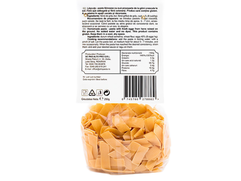 Ingrediente: făină de grâu dur, făină grifică de grâu, ouă 40% (8 ouă/kg).