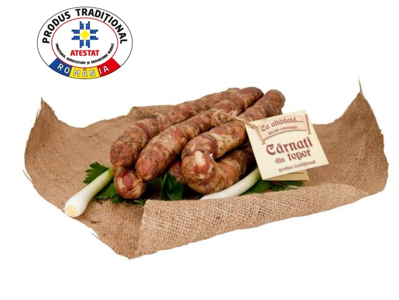 Toporul sau barda erau uneletele străbunicilor, unelte ce se foloseau la tăierea cărnii în bucăţele mici şi savuroase. Aceleaşi unelte sunt folosite şi pentru cârnaţii din topor. La fel cum făceau străbunii, carnea este amestecată cu sare, usturoi, cimbru, piper, şi boia de ardei dulce, apoi se lasă la frăgezit. Cu acest amestec se umplu cârnaţii, în membrane naturale, se pun la zvântat, apoi se afumă cu lemn de fag uscat până când se pătrund bine şi capătă o culoare naturală, arămie.