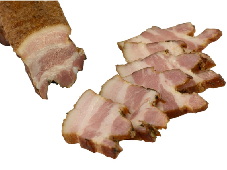 Ingrediente: felică de porc RO, sare cu nitrit, piper, usturoi, cimbru, ardei iute, dafin şi muştar boabe.