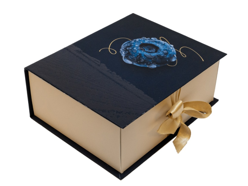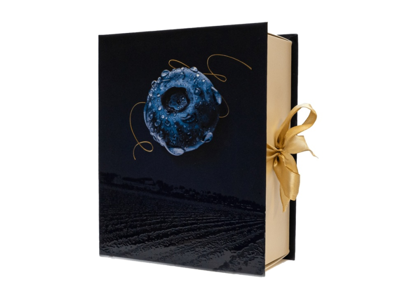 Cutia în formă de Carte Premium cu lăcuire selectivă şi foiţă aurie conține 1 x Nectar 300g şi 1 x Gem de afine 220g