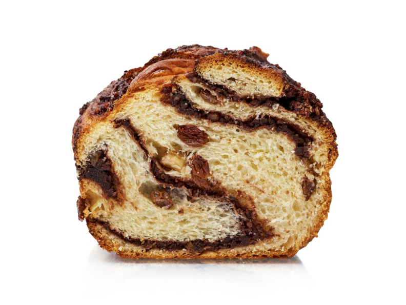 Ingrediente: 27% făină albă de grâu, zahăr, 16% nucă, lapte integral de vacă, ou întreg pasteurizat, unt cu 82% grăsime, albuş pasteurizat , 4% stafide brune, 4% coajă de portocală confiată (portocală, sirop de glucoză, acid citric, sorbat de potasiu, acid ascorbic), ulei de rapiță, drojdie de panificație, pudră de cacao belgiană, sare iodată, apă.