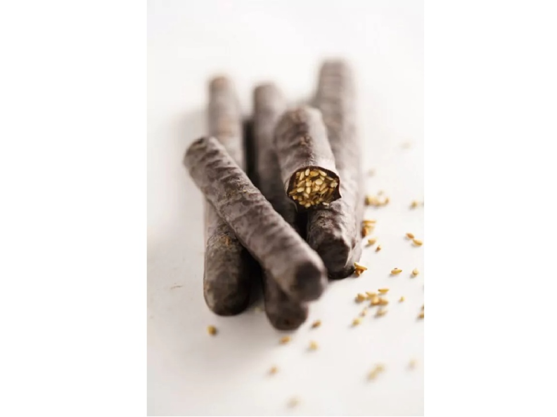 Ingrediente: seminţe de susan* 41%, ciocolată neagră* 35% (masă de cacao*, zahăr din trestie*, unt de cacao* 17.5%, cacao - conţinut redus de grăsimi*), sirop de glucoză*, zahăr brun*, miere*.