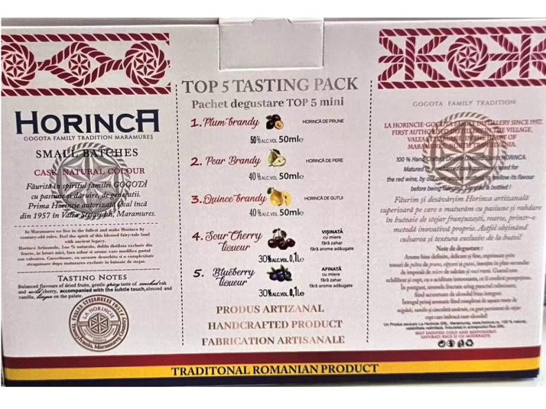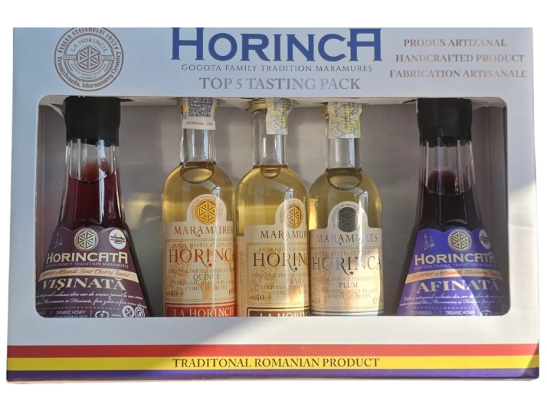 Un pachet de degustare special cu 5 sticle: o Afinată şi Vişinată la 100ml şi 3 miniaturi de 50ml de Horincă de Prune, Pere şi Gutui.