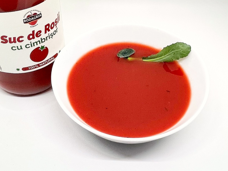 Ingrediente: roșii proaspete inimă de bou, ţărăneşti şi cherry, culese manual, presate la rece, cimbrişor şi sare.