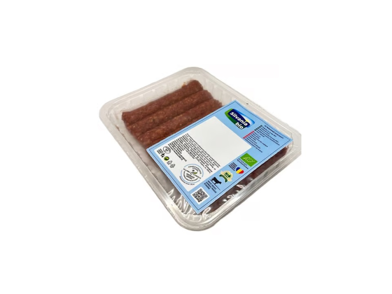 Ingrediente: carne de vită ecologică 79,5%, condimente ecologice (usturoi, piper negru, boia dulce, cimbru, boia iute), apa, sare